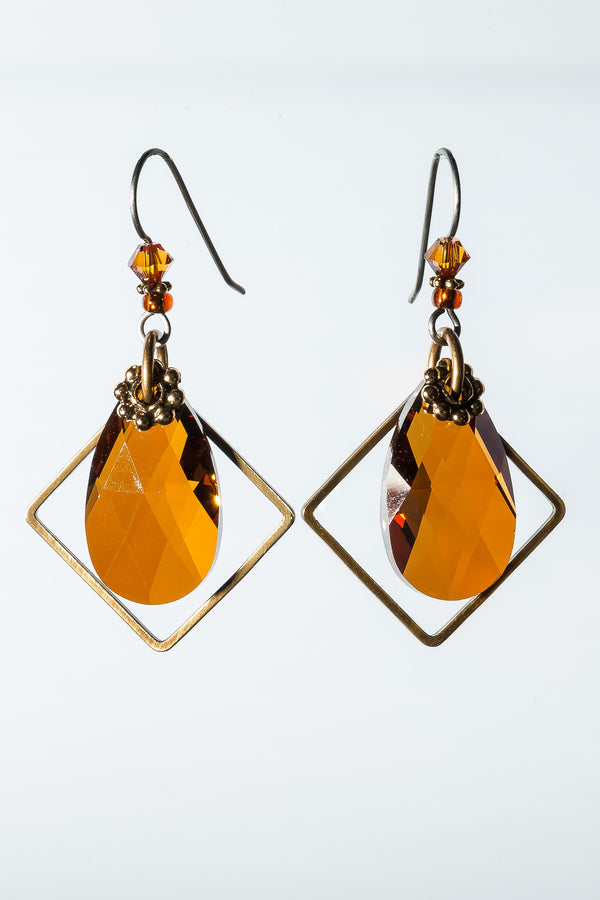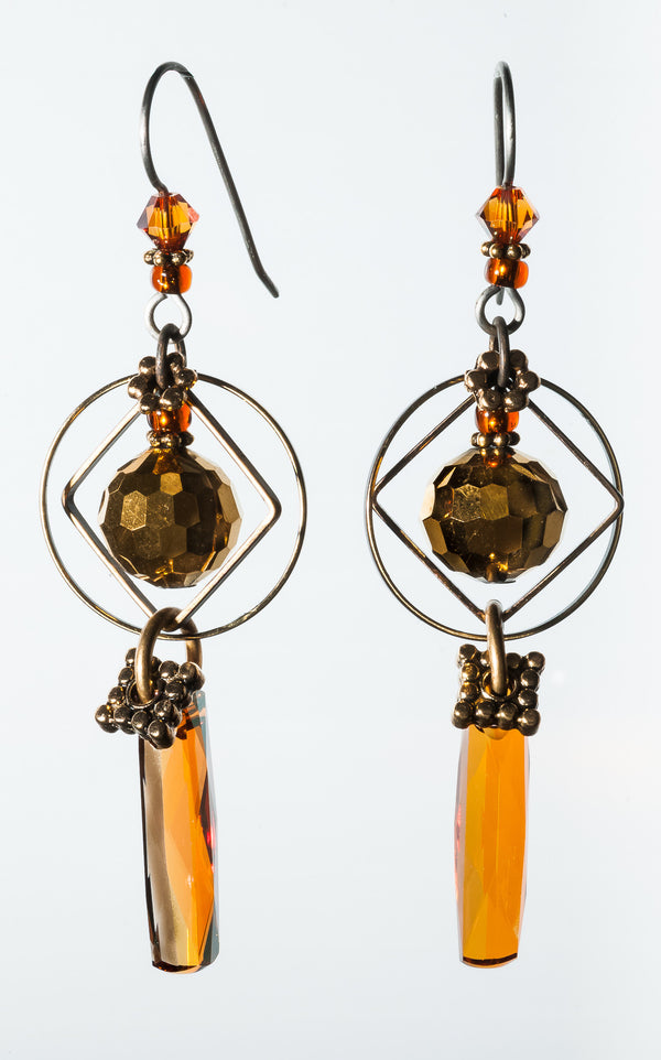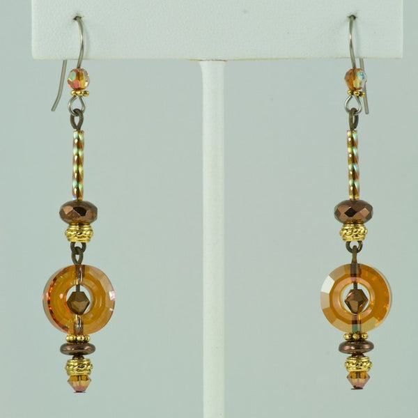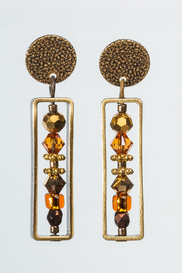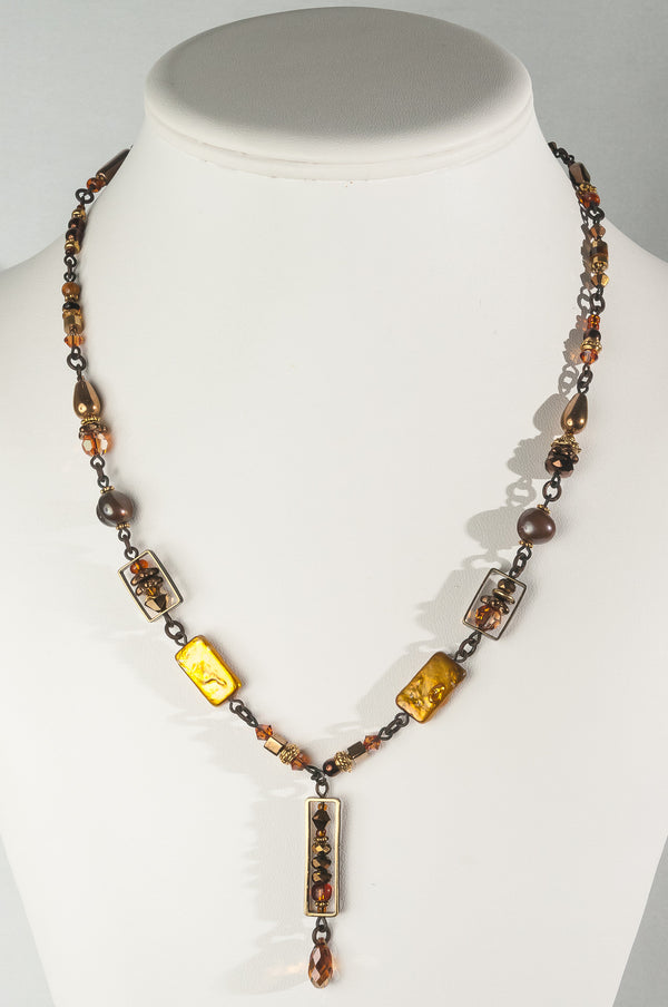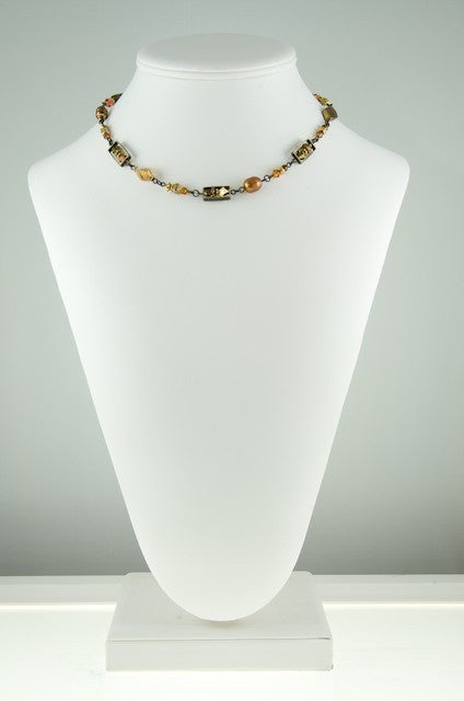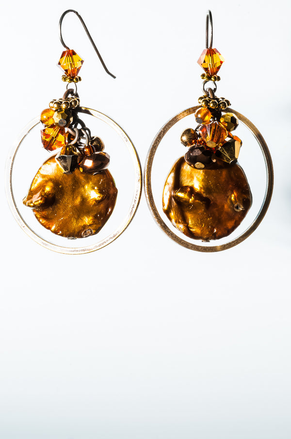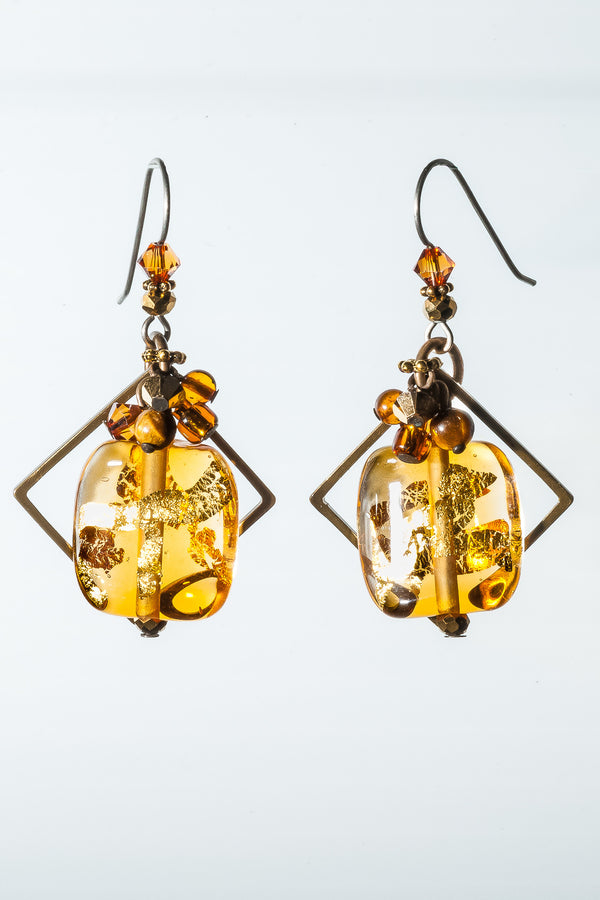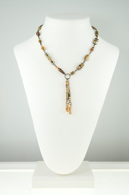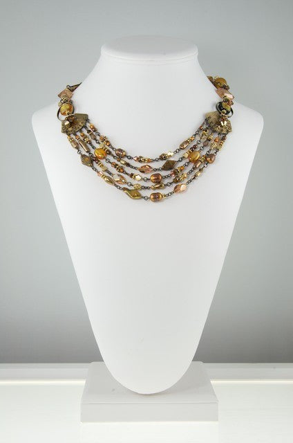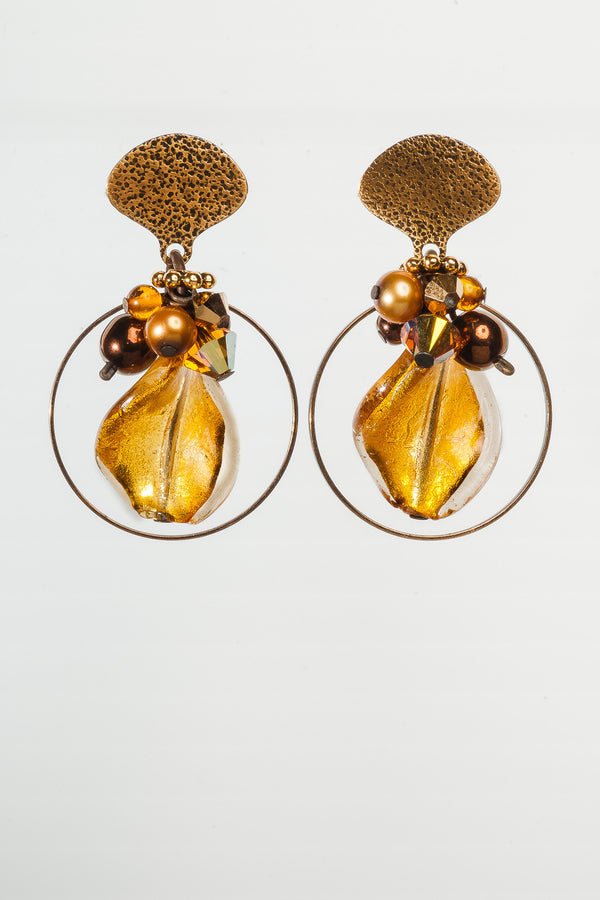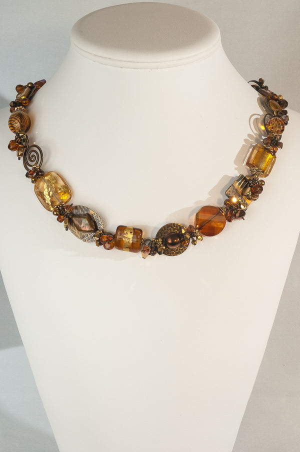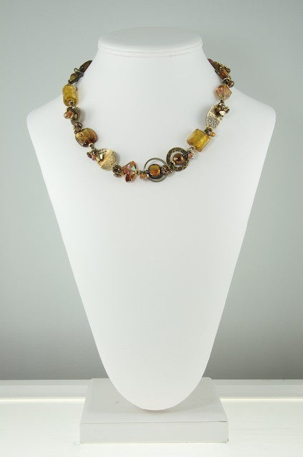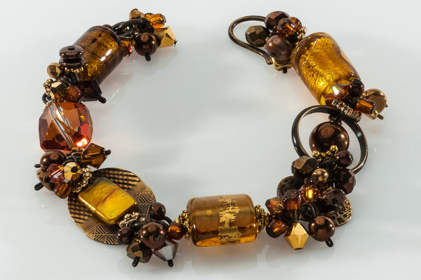 Blended, like a good curry—complex, subtle and warm—this collection features the deep, rich sheen of 24 karat gold leaf fused to the cool, curved surfaces of the hand-made glass. Shimmering bronze pearls, earth-toned, antiqued brass, and a generous sprinkling of fossils and semi-precious gemstones are fused in this collection.